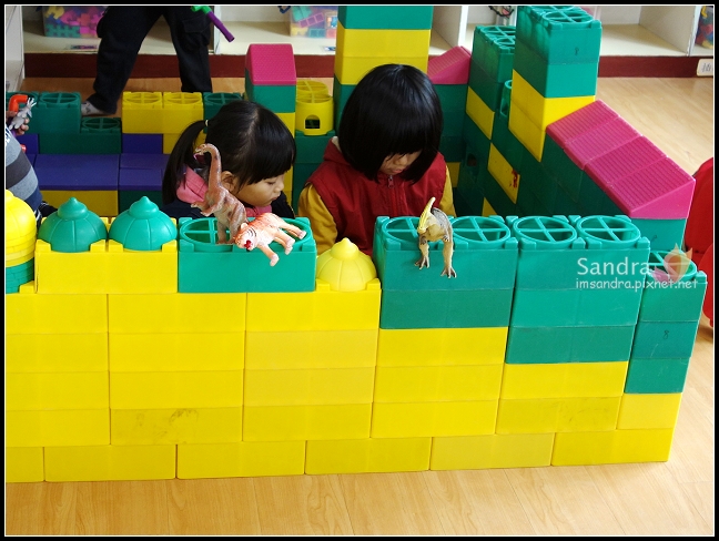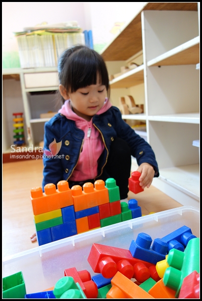 帶小寶到教室後我坐在他們用餐的小椅子上看著她跟同學自在的玩大積木