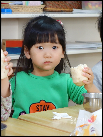學校吃點心前有點心歌,小朋友會一起唱完才吃,可是小寶兒不會唱