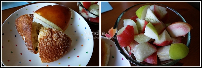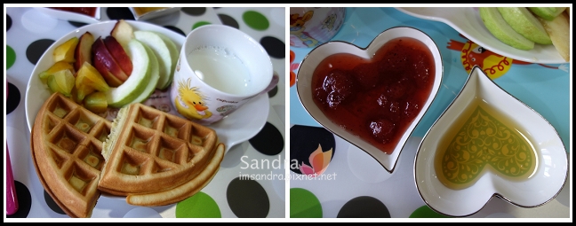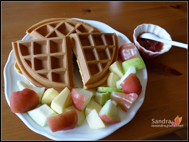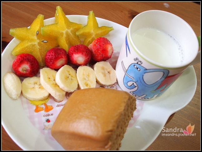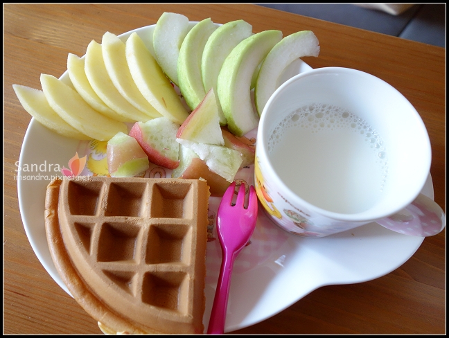 有鑒於上次準備太多吃不完,這天只切了薄片蘋果+薄片芭樂+蓮霧+一片鬆餅+半杯鮮奶