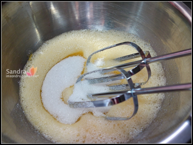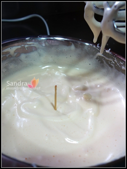 然後就一直打一直打,我用電動攪拌器中高速打,打發全蛋比只打蛋白需要的時間更多