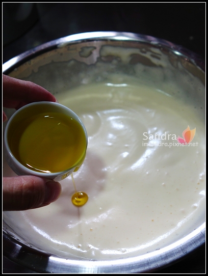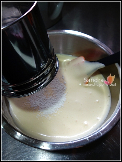 分兩次篩入低筋麵粉,切拌均勻後再加第二次