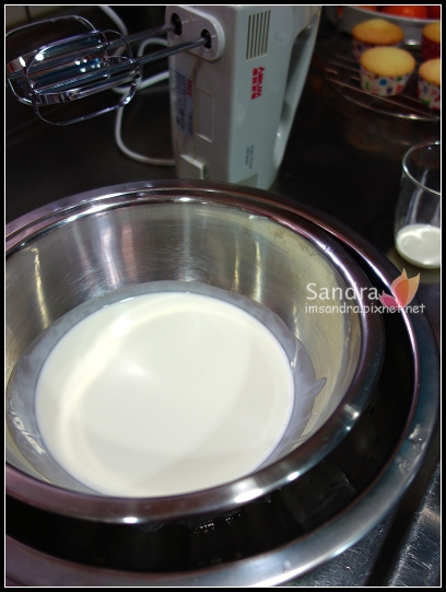 跟打發全蛋不一樣,鮮奶油要冰冰的打才好打發,所以剛剛拿來裝熱水的大鋼盆改裝冰塊了XD