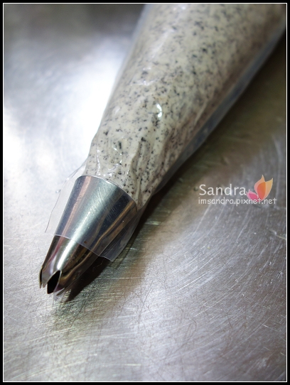 裝進擠花袋裡又是另一個悲劇.......我選的花嘴太小,鮮奶油打太硬好難擠啦(哭著跑開)