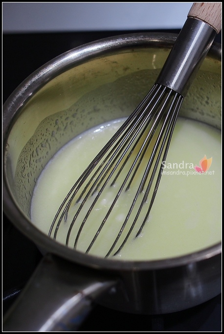 (6) 回瓦斯爐上小火一邊攪拌一邊煮,一開始非常稀且顏色泛白,很快就會變濃稠的淡黃色,請務必守在爐邊持續加熱攪拌