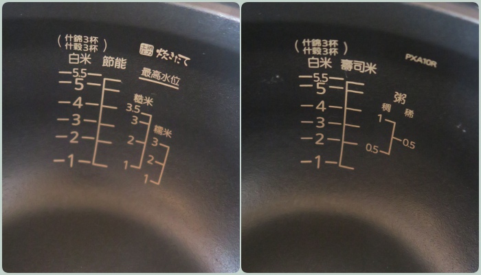鍋子的兩邊有不同種類米飯的水量刻度,我現在煮米已經沒有在量幾杯米放幾杯水